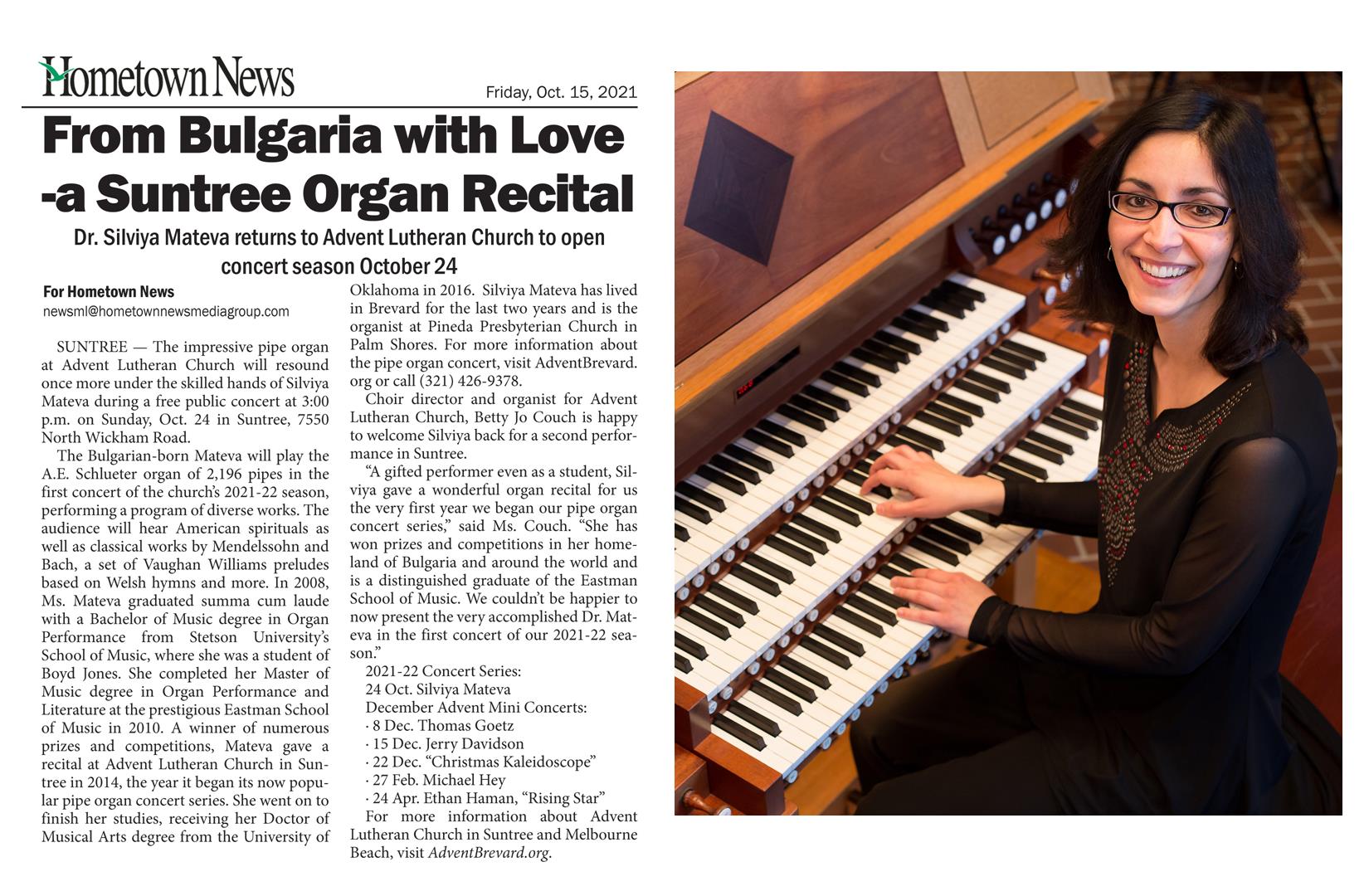 The impressive pipe organ at Advent Lutheran Church will resound once more under the skilled hands of Dr. Silviya Mateva during a free public concert at 3:00 p.m. on Sunday, Oct. 24 in Suntree, 7550 North Wickham Road.