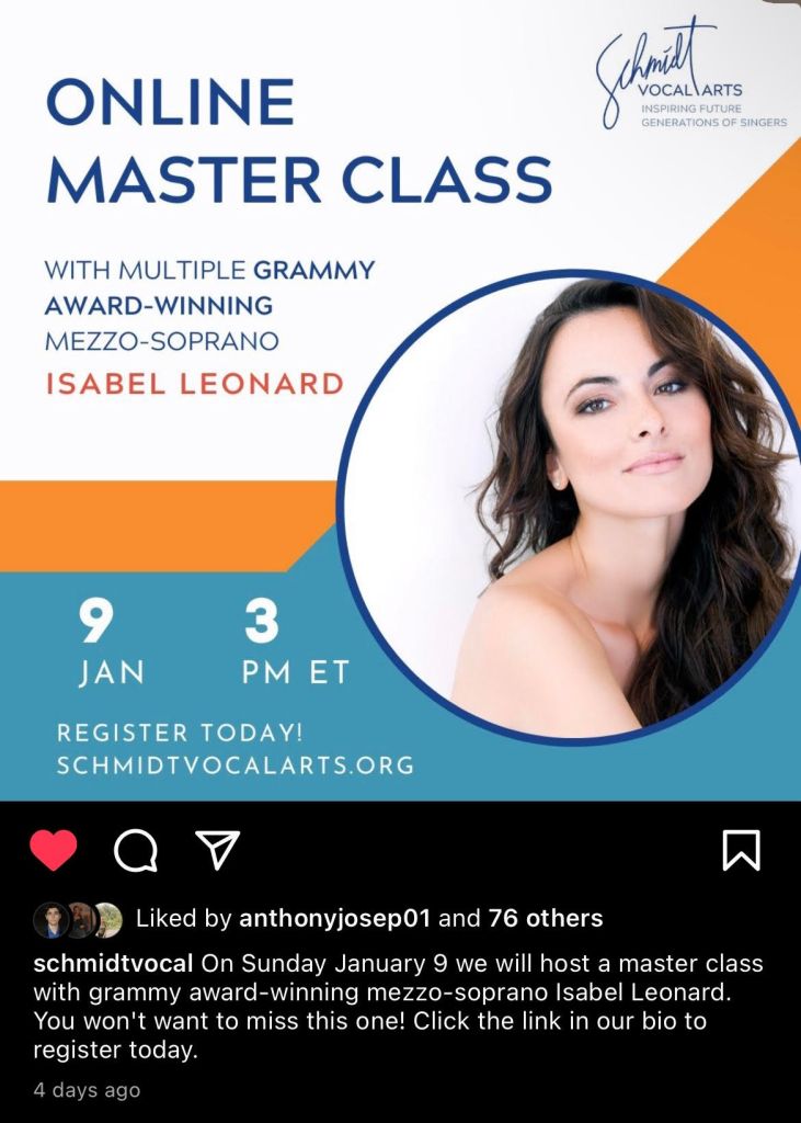 The Schmidt Vocal Arts Foundation has selected Stetson School of Music Junior Kaylan Hernandez as one of four participants in a Masterclass this Sunday with the Metropolitan Opera’s Grammy Award-winning mezzo-soprano Isabel Leonard. The event will take place online at 3:00pm this Sunday January 9, with viewing available via registration at the following site: https://us02web.zoom.us/webinar/register/WN_WCdQFFfcRaWYAfj7ZlEszA