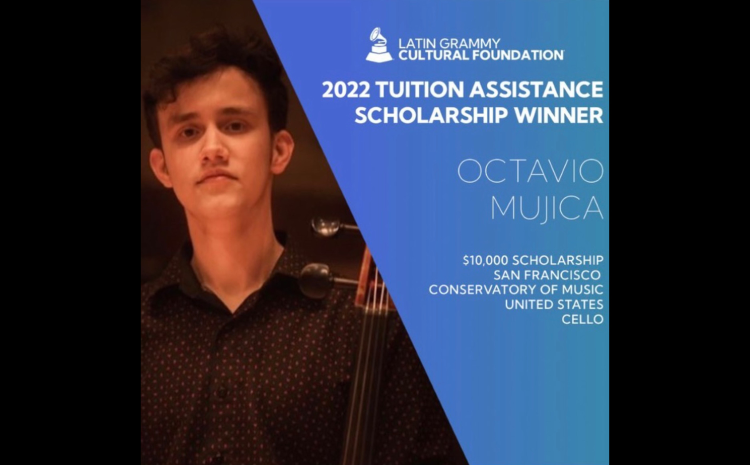 Cellist Alumnus Octavio Mujica (’21) was named the recipient of the Latin Grammy Cultural Foundation Scholarship. He will use the financial award to complete the second year of his Graduate studies at the San Francisco Conservatory of Music.