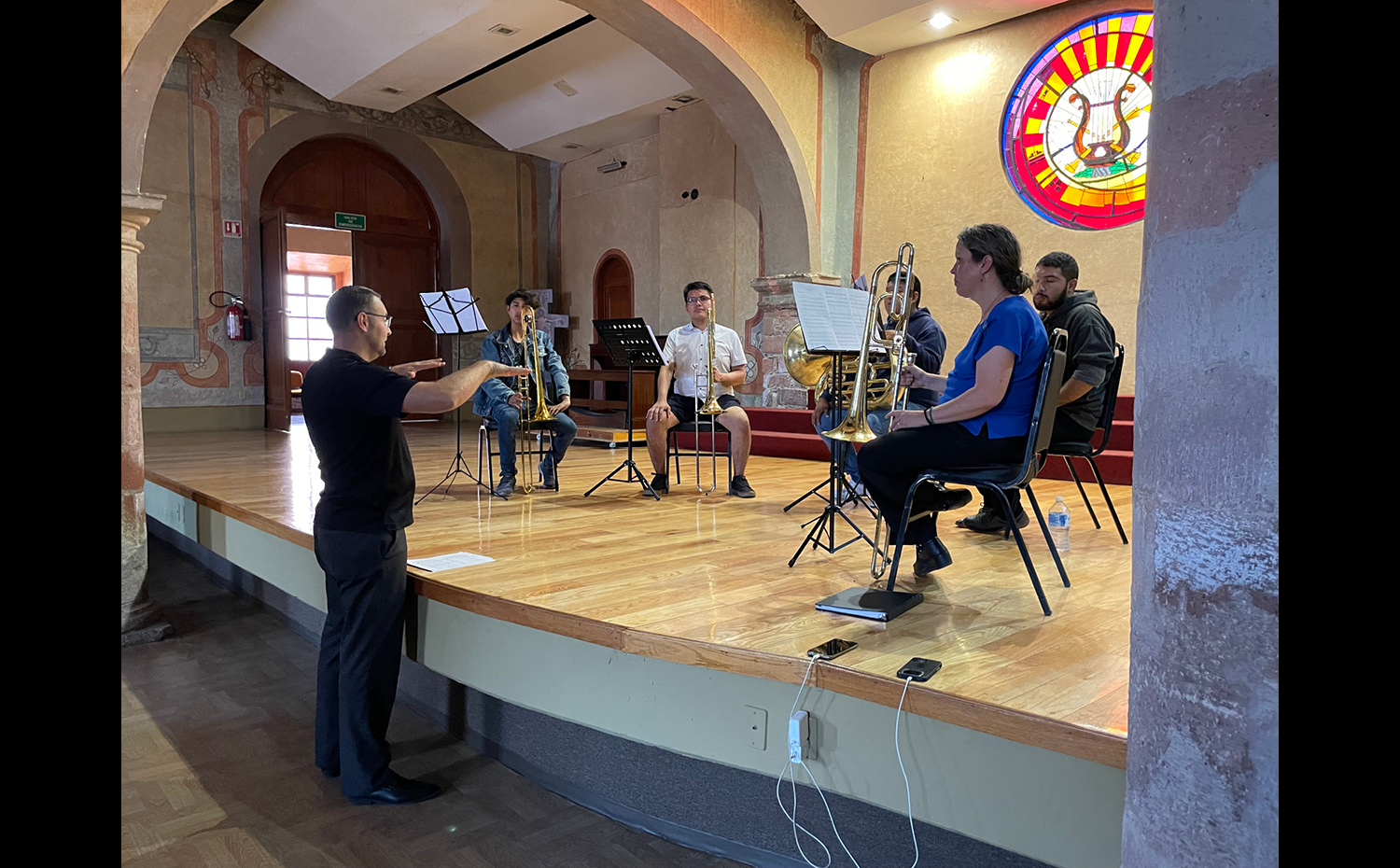 Daily workshop sessions were held from May 29 – June 2, 2023 with a culminating concert on Friday afternoon featuring the Juan Manuel Arpero Brass Ensemble, a representative group of brass majors from the Universidad Autónoma de Querétaro (UAQ) taught by Mtra. Sandra Kessler, and participants from throughout Central Mexico. In addition, Dr. Witek performed a trumpet solo with the Banda de Música del Estado de Querétaro (State Band), an ensemble of professional musicians who perform weekly concerts in and around Querétaro.