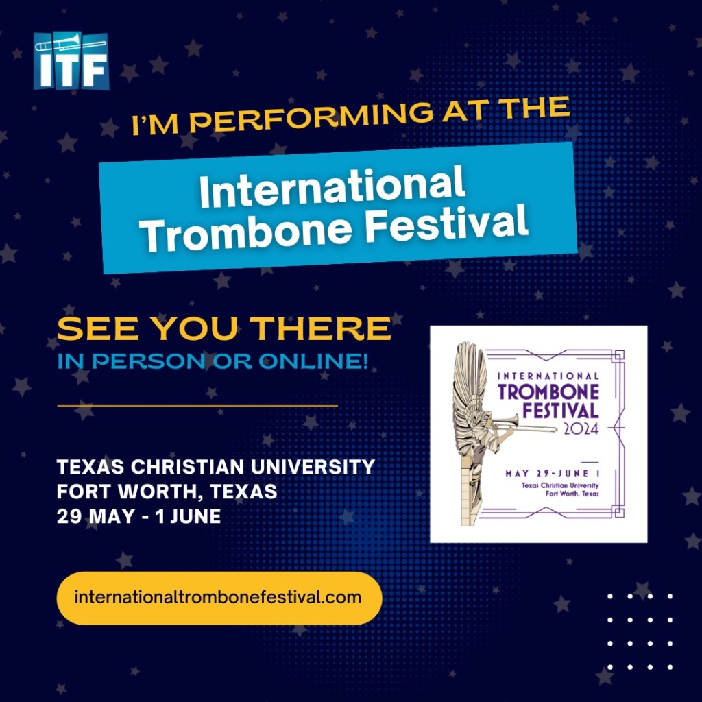 Dr. Dunwoody Mirvil, Assistant Professor of Trombone, has been invited to perform a guest artist recital at the 2024 International Trombone Festival taking place this May at Texas Christian University. The International Trombone Festival is an annual multi-day event featuring all things trombone. Each year, artists, teachers, students, professionals, industry leaders, and hobbyists gather to celebrate and explore the many facets and styles of trombone playing, teaching, and craftsmanship.