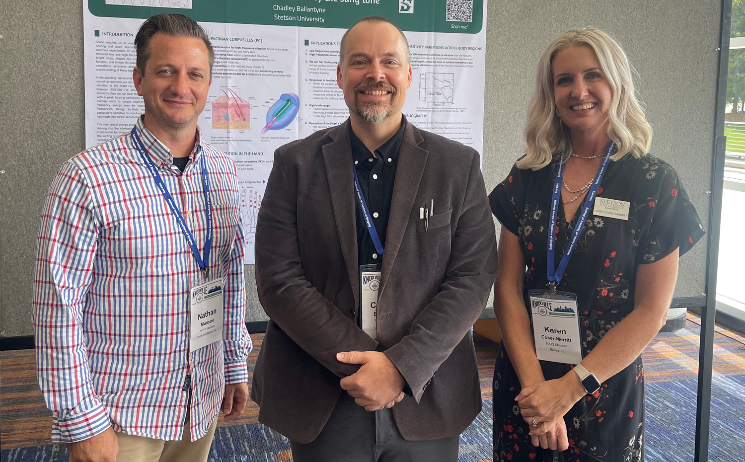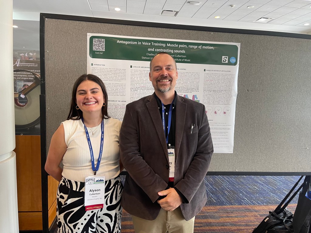Stetson’s voice faculty members, Dr. Nathan Munson, Dr. Karen Coker-Merritt, and Dr. Chadley Ballantyne, attended along with alumna Alyson Culbertson (BMp ’23). Dr. Ballantyne and Culbertson co-presented a poster session titled “Antagonism in Voice Training: Muscle Pairs, Range of Motion, and Contrasting Sounds.” Their presentation focused on an approach to voice instruction that explores the relationships between opposing muscle groups to create ranges of motion in the voice. This method encourages guided self-discovery through contrasting sounds which motivate contrasting positions, movements, modes, and mechanisms in the singing instrument.