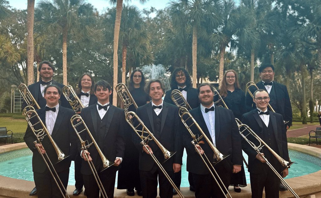 The Stetson University Trombone Choir has been invited to perform at the Florida Music Education Association Conference. The group’s performance is scheduled for Friday, January 10, at 4:45 p.m. in the Tampa Convention Center. The FMEA Professional Learning Conference is one of the largest music education professional learning events in the United States. In addition to approximately 250 clinic sessions and concerts, it hosts 23 All-State Ensembles featuring Florida’s top band, orchestra, chorus, guitar, Orff, and popular music students, conducted by world-class conductors and teachers. It is attended by more than 10,000 people, including secondary music directors, elementary music teachers, music supervisors, college students, college music teachers, school administrators, K-12 students performing in the All-State ensembles, students and professional musicians performing with invited performing ensembles, exhibitors, and parents and family members of performing students.