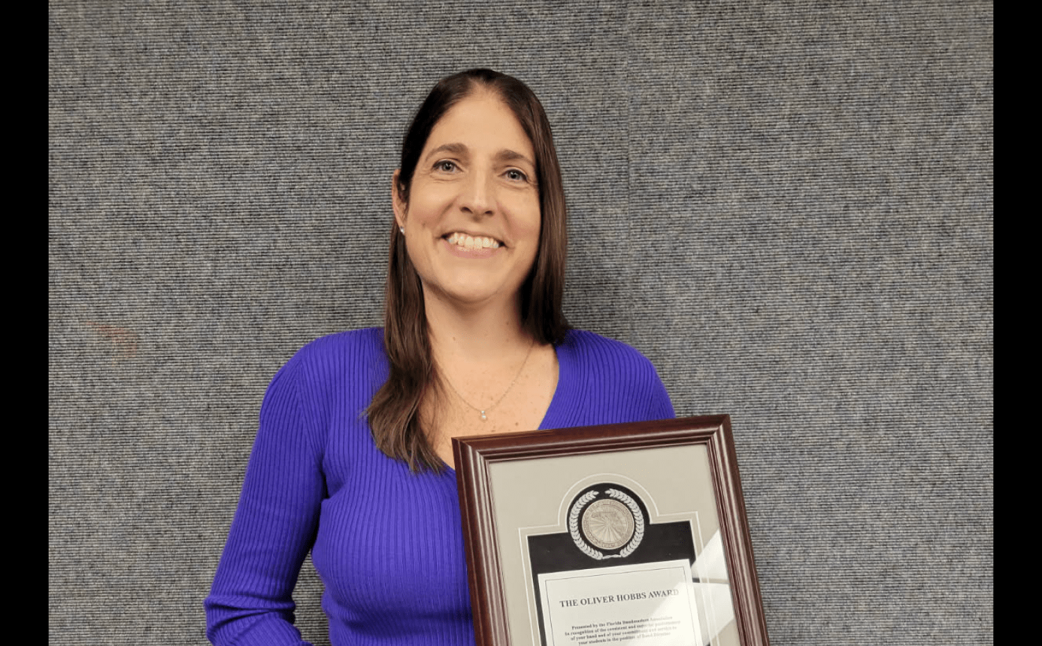 Mrs. Kerry (Couch) Waldo, a 2004 Music Education graduate of Stetson School of Music, was recently honored by the Florida Bandmaster’s Association (FBA) at the Florida Music Educators Association Conference with the presentation of the prestigious Oliver Hobbs Award. This highly selective award was presented “in recognition of the consistent and superior performance of your band and your commitment and service to your students in the position of Band Director.” Mrs. Waldo is in her 20th year of teaching in Seminole County, where she currently serves as the Director of Bands at Rock Lake Middle School in Longwood. In this position, her teaching responsibilities include three beginning band classes, a jazz band, a concert band and a symphonic band. Although Rock Lake has fewer than 1,000 students, participation in the band program averages between 250-275 each year! Bands under her direction consistently earn superior ratings at FBA Music Performance Assessments. In 2023, Mrs. Waldo was chosen as the Teacher of the Year for Rock Lake Middle School.
